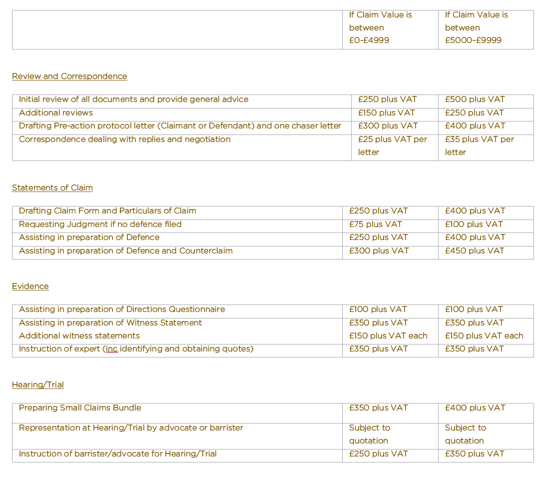 Fees do not include Court fees or Hearing/Trial representation fees. All disbursements are payable separately.